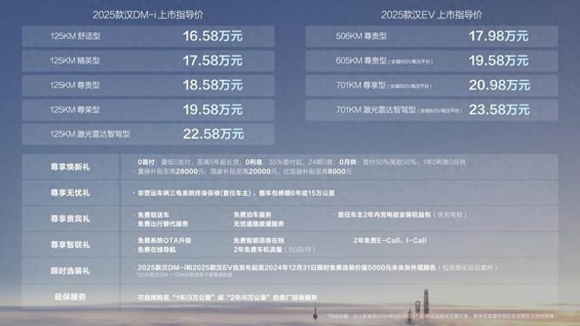 其间,2025款汉EV共推出4款车型,价格17.98万~23.58万元;2025款汉DM-i共推出5款车型,价格16.58万~22.58万元。一起,比亚迪为用户预备了包含“尊享焕新礼、尊享无忧礼、尊享贵宾礼、尊享智联礼、限时选装礼、延保服务”六重购车礼遇。值得一提的是,2024年12月31日前,购车可限时免费选装未央灰车色与黑化运动套件,总价值5000元。