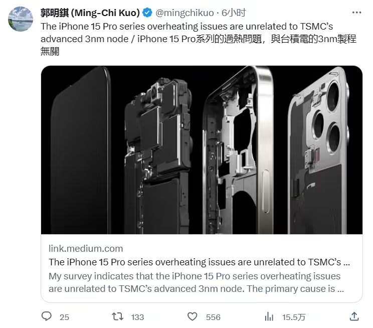 天风世界分析师郭明錤今天发文,针对现在苹果 iPhone 15 Pro 手机过热问题进行了解读,并表明“与台积电 3nm 制程无关”。